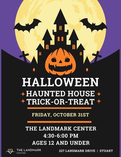 The Landmark Center will host their Halloween program for ages 12 and under on Friday October 31st, 2025, 4:30 p.m. to 6:00 p.m. Haunted House, Trick-or-Treat for the youngsters. Join us.