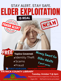 Patrick County Library is hosting a FREE 2-part series for ages 55+ on Tuesday, October 7th at 2:00 p.m. Topics covered: Identity Theft, Scams, Fraud -- Money Smart for Older Adults. Speakers: Lisa Kroplin and Shannon Hylton. Registration encouraged, but not required. Refreshments provided.