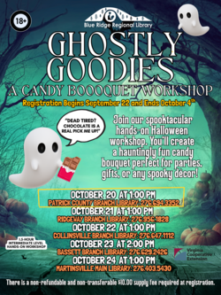 Join our spooktacular hands-on Halloween workshop. You'll create a hauntingly fun candy bouquet perfect for parties, gifts, or any spooky decor! $10 supply fee (non-refundable and non-transferable). Registration required. Date: October 20th, 1:00 p.m. at the Patrick County Branch Library. 1.5-hour intermediate-level, hands-on workshop. Registration begins September 22nd and ends October 4th. For more information or to register: 276-694-3352.