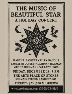 The Stokes County Arts Council will host The Music of Beautiful Star: A Holiday Concert with musical artists Martha Bassett, Riley Baugus, Laurelyn Dossett, Dashawn Hickman, Wendy Hickman, and Pat Lawrence. Date of Concert: Friday, December 19, 2025, 7:00 p.m. Tickets $25 per person ($20 for SCAC Members). For more information visit www.stokesarts.org or call 336-593-8159.