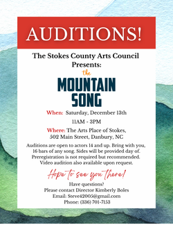 The Stokes County Arts Council will present the "Mountain Song" on Saturday, December 13, 2025, 11:00 a.m. to 3:00 p.m. at The Arts Place of Stokes, 502 Main Street, Danbury, NC 27016. Auditions are open to actors 14 and up. Bring with you 16 bars of any song. Sides will be provided day of. Preregistration is not required but recommended. Video audition also available upon request. Have questions, contact Director Kimberly Boles. Email: steve42005@gmail.com or phone: 336-701-7153.