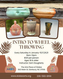 The Stokes County Arts Council will host Sam Dougherty and Intro to Wheel Throwing every Saturday in January 2026 (January 10, 17, 24, 31). Time: 9:00 a.m. until 12:00 p.m. $120 per person. Ages 18 and older. For more information or to register call 336-593-8159 or visit www.stokesarts.org.