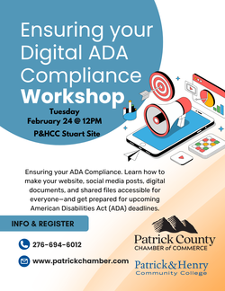 The Patrick County Chamber of Commerce, in partnership with Patrick & Henry Community College, invites you to a Lunch & Learn workshop—“Ensuring Your ADA Compliance.”