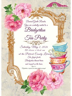 Dearest Gentle Reader, the social season is upon us, and you are cordially invited to join us on Saturday, May 2nd, 2026, at 11am at the Patrick County Library for a Bridgerton Themed Tea Party in the assembly room. Partake in the season's most anticipated trivia game, where you will be quizzed on both the television show and the literature by Julia Quinn. We do ask that this event be ages 16+ and registration is required. We encourage you dress in your finest regency wear but don't spend all your dowry on a new frock. There will be a luncheon and a game of croquet on the lawn as well. Please make your reservation by contacting 276-694-3352. Twenty seats are available to members of the ton. Do make haste.