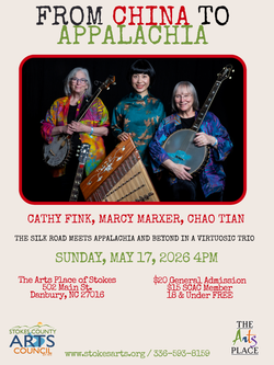 Stokes Arts will host Cathy Fink, Marcy Marxer, and Chao Tian with their musical program of "From China to Appalachia" on Sunday, May 17, 2026, 4:00 p.m. The Silk Road meets Appalachia and beyond in a virtuosic trio. Admission: $20 General Admission, $15 SCAC Members, 18 and under FREE.