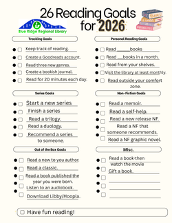 The Patrick County Library has made a list of 26 reading goals for 2026 for you, the reader to use. Topics: Tracking Goals, Series Goals, out of the Box Goals, Personal Reading Goals, Non-Fiction Goals and Miscellaneous. Use this format to track your reading goals for 2026. Have Fun Reading!