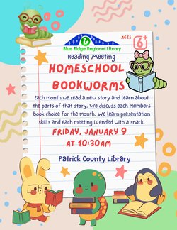 Join us for a Homeschool Bookworms Reading Meeting, Friday, January 9, 2026, at 10:30 a.m. at the Patrick County Library. Read a new story and learn about the parts of the story.