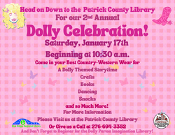 Head on down to the Patrick County Library for our 2nd annual Dolly Celebration on Saturday, January 17, 2026, beginning at 10:30 a.m. Come in your best country western wear for a Dolly-themed story time, crafts, books, dancing, snacks and more. For additional information call 276-694-3352.