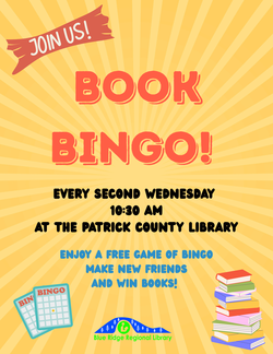 The Patrick County Library will host Book Bingo every second Wednesday of the month, 10:30 a.m. Enjoy a free game of Bingo. Make new friends and win books!