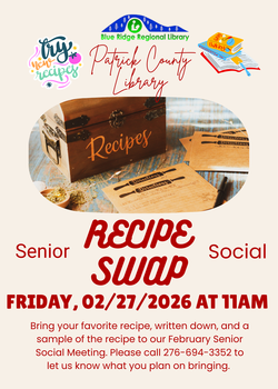 The Patrick County Library will host a Senior Recipe Swap Social on Friday, February 27, 2026, at 11:00 a.m. Bring your favorite recipe, written down, and a sample of the recipe to our February Senior Social meeting. Please call 276-694-3352 to let us know what you plan on bringing.