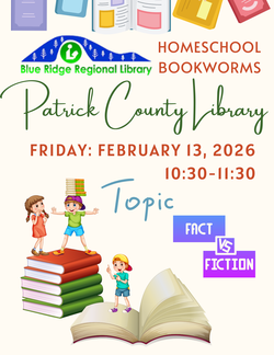 The Patrick County Library will host Homeschool Bookworms on Friday, February 13, 2026, 10:30 a.m. to 11:30 a.m. Topic: Fact Vs. Fiction.