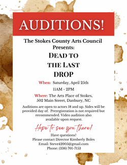 The Stokes County Arts Council will present the Dead to the Last Drop on Saturday, April 25th, 11:00 a.m. to 2:00 p.m. Auditions open to actors 18 years and up. Questions, call Kimberly Boles at 336-701-7158.