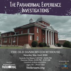 The Paranormal Experience Investigations at The Old Danbury Courthouse on Saturday, May 23, 2026. Scaredy Cat Hours: 7:00 p.m. to 10:00 p.m. Extreme Hours: 11 p.m. to 2:00 a.m. Ages 16 plus. Price $35.00. Hosted by Stokes Paranormal.