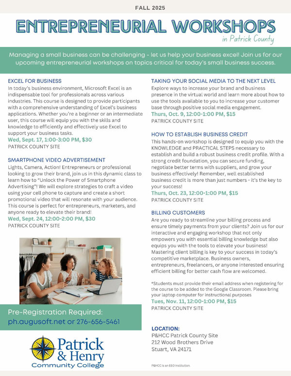 The Patrick County Chamber of Commerce, in partnership with P&HCC is pleased to announce Entrepreneurial Workshops to be offered to our community at the Patrick County Site. These one or two-hour workshops help to equip our local businesses with skills to succeed. Anyone is welcome to register and for Chamber Members in good standing, we will reimburse you after completion of the workshop(s). . . .