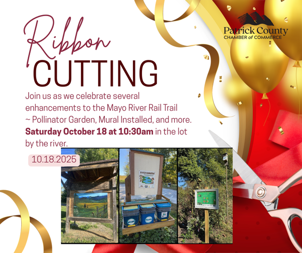 Join us as we celebrate several enhancements to the Mayo River Rail Trail ~ Pollinator Garden, Mural Installed and more with a Ribbon Cutting Ceremony on Saturday, October 18, 2025, at 10:30 a.m. in the lot by the river. Host: Patrick County Chamber of Commerce.