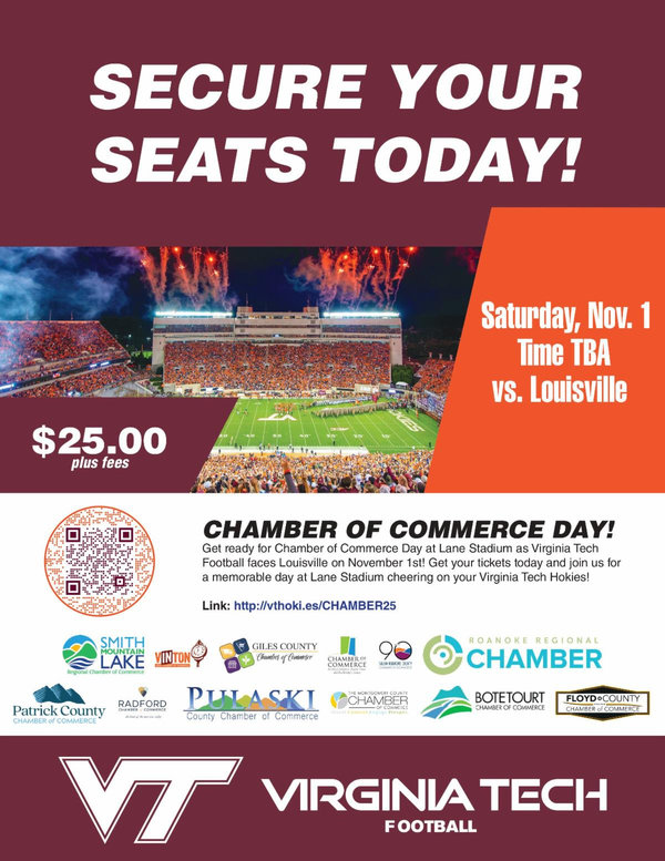 Get ready for Chamber of Commerce Day at Lane Stadium as Virginia Tech Football faces Louisville on November 1st! 12 Chambers have come together in collaboration, and we encourage our respective members to purchase tickets and join the fun for a fantastic day of networking, regionalism, and football!
