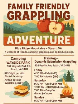 Want to start your fall off right? Join us in the beautiful Blue Ridge Mountains of Stuart Virginia. Bring the family and make it an adventure. A weekend of friends, camping, grappling and apple dumplings. Camping at Wayside Park ($25 per night). Grappling: