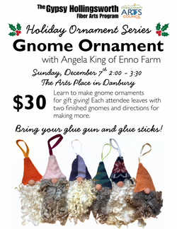 The Stokes County Arts Council to host as part of The Gypsy Hollingsworth Fibert Arts Program a holiday gnome ornament class with Angela King of Enno Farm on Sunday, December 7th, 2025, 2:00 p.m. to 3:30 p.m. at The Arts Place of Stokes. Learn to make gnome ornaments for gift giving. Each attendee leaves with two finished gnomes and directions for making more. Bring your glue gun and glue sticks. Cost: $30 per person.