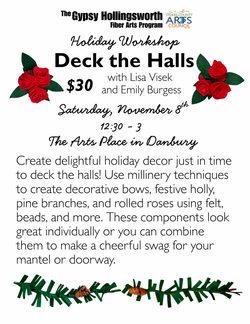 Join us on Saturday, November 8th, 2025, 12:30 p.m. until 3:00 p.m. for Deck the Halls, a holiday workshop with Lisa Visek and Emily Burgess at The Arts Place of Stokes. Create decorative bows, festive holly, pine branches, and rolled roses using felt, beads and more. Cost: $30 per person. This is part of the Gypsy Hollingsworth Fiber Arts program. Call Stokes Arts to register or for additional information.