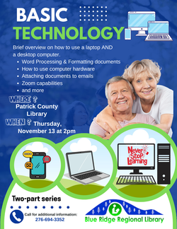 Join us for a Basic Technology class -- Brief overview on how to use a laptop and a desktop computer: word processing and formatting documents, how to use computer hardware, attaching documents to emails, zoom capabilities and more. Class offering at the Patrick County Library, Thursday, November 13, 2025, starting at 2:00 p.m. Call for additional information: 276-694-3352.
