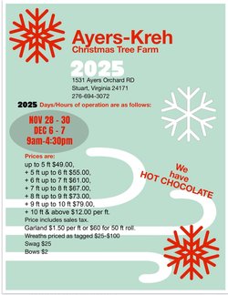 Ayers-Kreh Christmas Tree Farm will be open November 28th through November 30th and December 6th and December 7th, 2025. Time: 9:00 a.m. to 4:30 p.m. Prices are: Up to 5 feet ($49.00), +5 feet up to 6 feet ($55.00), +6 feet up to 7 feet ($61.00), +7 feet up to 8 feet ($67.00), +8 feet up to 9 feet ($73.00), +9 feet up to 10 feet ($79.00), +$10 feet and above $12.00 per foot (prices include sales tax). Garland $1.50 per foot or $60 for 50-foot roll. Wreaths prices as tagged ($25.00 up to $100.00). Swag prices: $25.00 and Bows $2.00.