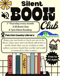 The Patrick County Library will host the Silent Book Club, 1st Thursday every month (2025), 5:30 p.m. (Book Chat) and 6:00 p.m. to 7:00 p.m. (Silent Reading). Free to all ages. Bring your own book or check one out at the library.