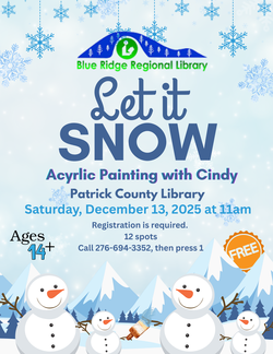 The Patrick County Library invites you to join in an Acrylic Painting class with Cindy on Saturday, December 13, 2025, at 11:00 a.m. Registration is required. There are 12 spots available. Ages 14 plus. Call 276-694-3352, then press 1.