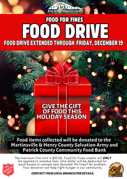 "Food for Fines" Food Drive (food drive extended through Friday, December 19, 2025. Give the gift of food this holiday season. Food items collected will be donated to the Martinsville and Henry County Salvation Army and Patrick County Food Bank. Contact your local branch library for details.
