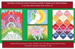 The Stokes County Arts Council will host artist Garnet Goldman in the Apple Gallery November 16, 2025, through December 31, 2025. A Meet and Greet is scheduled for Sunday, December 7, 2025, from 2:00 p.m. to 3:30 p.m. during Christmas in Danbury. Viewing of this exhibit is FREE to the public. For more information, visit www.stokesarts.org or call 336-593-8159.