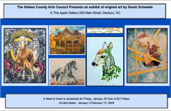 The Stokes County Arts Council has rescheduled the Meet and Greet date for artist Sarah Schwalm whose artwork is on display at The Apple Gallery. The new date is Saturday, February 7, 2026. Please visit Stokes Arts Facebook Page or website at www.stokesarts.org for more information. Viewing of the exhibit is free and open to the public.