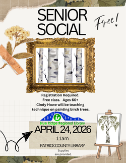 The Patrick County Library will host the Senior Social on April 24, 2026, 11:00 a.m. This is a free event. Registration required. Ages 60 plus. Cindy Howe will be teaching techniques in painting birch trees. Supplies are provided.