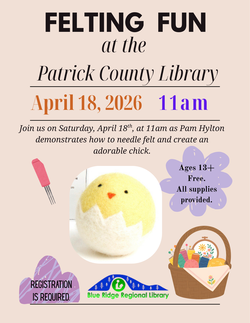 Join us Saturday, April 18, 2026, at 11:00 a.m. as Pam Hylton demonstrates how to needle felt and create an adorable chick. Ages 13 plus. Free. All supplies provided. Registration required.