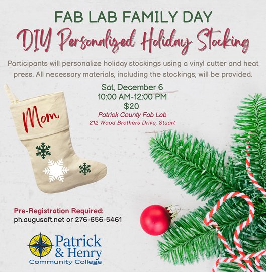 Personalize your own Christmas Stocking at the Fab lab in Stuart 10am to 12pm *Fee