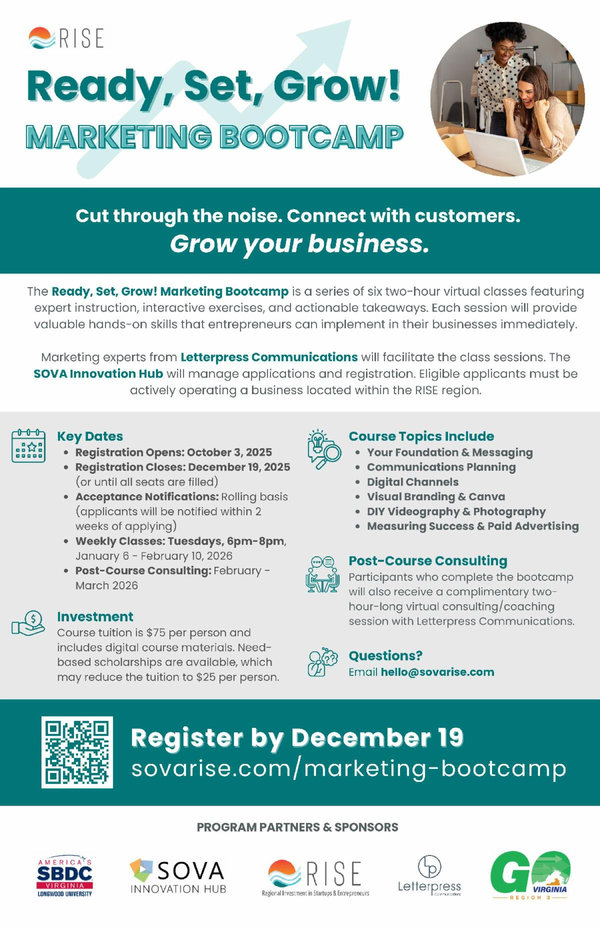 Businesses, entrepreneurs, six two-hour virtual classes feature expert instructors on how to grow your business. Topics: Your Foundation and Messaging, Communications Planning, Digital Channels, Visual Branding and Canva, DIV Videography and Photography, Measuring Success and Paid Advertising. Questions: email:hello@sovarise.org. . . .
