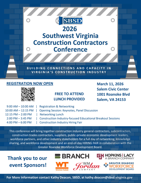 The Virginia Department of SBSD will host the 2026 Southwest Virginia Construction Contractors Conference - Building Connections and Capacity in Virginia's Construction Industry. The conference will be held at the Salem Civic Center, 1001 Roanoke Blvd, Salem, VA 24153 on Wednesday, March 11, 2026, 9:00 AM to 6:00 PM. Free to attend. Lunch provided.