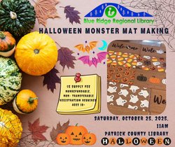 Join us for a Halloween Monster Mat Making Class. $5 Supply fee. Nonrefundable, non-transferable. Registration required. Ages 18+. Date: Saturday, October 25, 2025, 11:00 a.m. Patrick County Library.