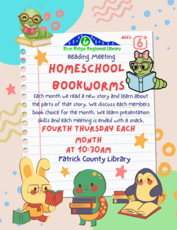 Each month we read a new story and learn about the parts of that story. We learn presentation skills and each meeting is ended with a snack. Reading Meeting for Homeschool Bookworms for ages 6+. Meet the fourth Thursday of each month at 10:30 a.m. at the Patrick County Library.