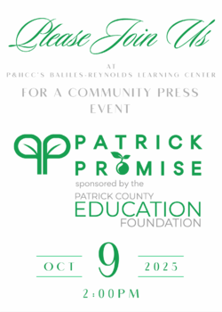 Please join us at Patrick and Henry Community College's Baliles-Reynolds Learning Center for a Community Press Event -- Patrick Promise sponsored by the Patrick County Education Foundation. Date: October 9, 2025, 2:00 p.m. Location: 645 Patriot Avenue, Martinsville, VA 24112. For more information, call 276-656-0202.