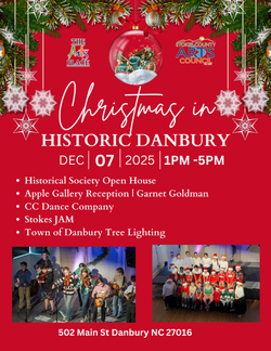 Join us for Christmas in Historic Danbury, Sunday, December 7, 2025, 1:00 p.m. to 5:00 p.m. Stokes County Historical Society Open House, Apple Gallery Reception featuring Garnet Goldman artwork, CC Dance Company, Stokes JAM, and Town of Danbury Tree Lighting.