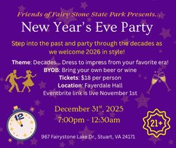 The Friends of Fairy Stone are excited to invite you to our New Year’s Eve party this year! This is a 21+ event, feel free to bring your own beer, wine, or finger foods. Don't forget to dress to impress in your favorite decade's attire. Join us in Fayerdale Hall at Fairy Stone State Park to ring in the new year on December 31st, 2025 from 7:00 p.m. until 12:30 a.m.! Each ticket purchase supports our friends group and future events like this!