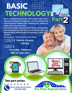 Join us for Basic Technology Part 2 at the Patrick County Library, Thursday, February 26, 2026, 1:00 p.m. to 2:00 p.m. Class will include basic computer skills, communications, internet and apps and photography. Call 276-694-3352 for more information or to register.