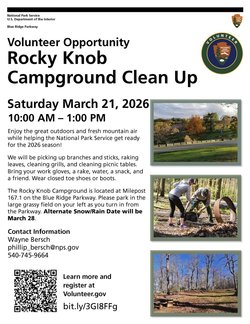 Attention Volunteers: Rocky Knob Campground Clean Up Project, Saturday, March 21, 2026, 10:00 a.m. to 1:00 p.m. Please help the Blue Ridge Parkway help clean the Rocky Knob Campground. Enjoy the great outdoors and fresh mountain air while helping the National Park Service get ready for the 2026 season. Bring your gloves, a rake, water, a snack, and a friend. Wear closed toe shoes or boots. The Rocky Knob Campground is located at Milepost 167.1 on the Blue Ridge Parkway. Please, park your vehicle in the large grassy field on your left as you turn in from the Parkway. For more information contact Wayne Bersch at phillip_bersch@nps.gov or by calling 540-745-9664. Alternate Snow / Rain Date will be Saturday, March 28th, 2026.