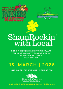The Stuart Farmers’ Market, in partnership with Bull Mountain Arts and the Patrick County Chamber of Commerce, invites the community to “Shamrockin’ with Local Vendors,” a festive indoor pop-up market celebrating local food, art, and handmade goods.