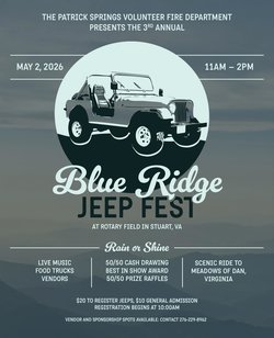 The Patrick Springs Volunteer Fire Department will present the Third Annual Blue Ridge Jeep Fest on Saturday, May 2, 2026, 11:00 a.m. to 2:00 p.m. at Rotary Field in Stuart, VA. Rain or Shine. Live Music, Food Trucks, Vendors, 50/50 Cash Drawing, Best in Show Award, 50/50 Prize Raffles. $20 to Register Jeep. $10 General Admission. Registration begins at 10:00 a.m. Vendor and Sponsorship spots available. Contact 276-229-8962.