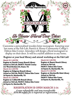 "Monograms" -- In Bloom: Floral Door Decor. Ages 18 years and up. Sponsored by Blue Ridge Regional Library. Attend workshops at the Fab Lab and create your own Floral Door Decor. Register at your local library as follows: March 23, 2026, 1:00 p.m.-- Register at the Patrick County Branch Library and attend the Fab Lab, P&HCC - Stuart site. / March 24, 2026, 1:00 p.m. -- Register at Ridgeway Branch Library and attend the Fab Lab, P&HCC Dalton Idea Center, Martinsville. / March 25, 2026, 1:00 p.m. -- Register at Collinsville Branch Library and attend the Fab Lab at P&HCC Dalton Idea Center, Martinsville. / March 26, 2026, 1:00 p.m. -- Register at Bassett Branch Library and attend at the Fab Lab at P&HCC Dalton Idea Center, Martinsville. / March 27, 2026, 1:00 p.m. -- Register at Martinsville Main Library and attend at the Fab Lab at P&HCC Dalton Idea Center, Martinsville.