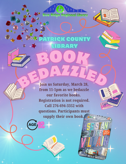 Join us at the Patrick County Branch Library on Saturday, March 28, 2026, from 11:00 a.m. until 1:00 p.m. as we bedazzle our favorite books. Registration not required. Call 276-694-3352 with questions. Participants must supply their own book.