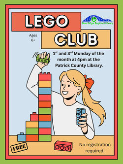 The Patrick County Branch Library will host LEGO Club for ages 6 plus, the first and third Mondays of the month at 4:00 p.m. FREE. No registration required.