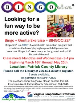 Looking for a fun way to be more active? Bingo, gentle exercise = Bingocize. Free 10 week health promotion program that combines the fun of playing bingo with fall prevention exercises. Class meets Mondays and Wednesdays, 3:00 p.m. to 4:00 p.m. beginning March 16th through May 20th, 2026. Please call to register at 276-694-3352. Twelve seats available. Sponsor: Terri Alt with the Patrick County Extention Office (for questions: 276) 694-3341.