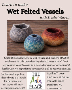 April 25, 2026, 9:00 AM to 12:00 PM at The Arts Place of Stokes. Learn the foundations of wet felting and explore 3D fiber sculpture in this introductory class. Create a 9 X 9 inch (approximately) expressive vessel to use as a bowl, dry vase, or ornamental birdhouse. No experience necessary! Cost: $65 per person, includes all supplies. Bring 2-3 towels for personal use. Ages 11-16 years old must be accompanied by an adult. Call 336-593-8159 to reserve your space or visit www.stokesarts.org.