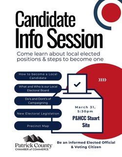 The Patrick County Chamber of Commerce will host a Candidate Info Session on Tuesday, March 31, 2026, at 5:30 p.m. at the P&HCC Stuart Site. This informative session is designed for residents interested in learning more about local elected offices and the steps required to become a candidate. The event will provide a comprehensive overview of: (1) How to become a local candidate. (2) The role and responsibilities of the local Electoral Board. (3) The do(s) and don’t(s) of campaigning. (4) New electoral legislation. (5) An overview of the local precinct map. Whether you are considering a run for office or simply want to become a more informed voting citizen, this session will offer valuable insights into the local electoral process. Presenter will be Susan Taylor, Director of Elections and Registrar for Patrick County. The Patrick County Chamber of Commerce encourages community members to attend and take advantage of this opportunity to better understand how local government works and how to get involved.